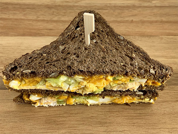 Ajoutez quelques lamelles d’escalope de poulet saisies à la poêle, un oeuf dur coupé en fines tranches et quelques feuilles de salade croquante assaisonnées. Fermez le sandwich, coupez-le en diagonale.
