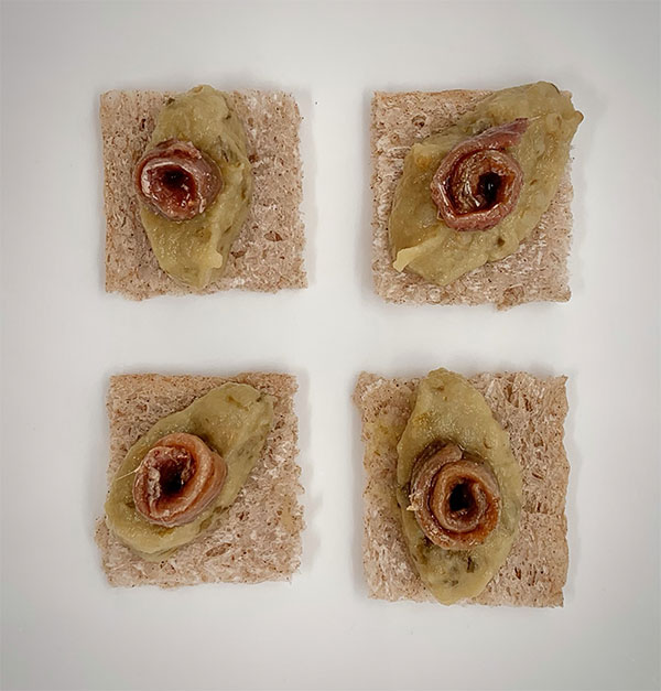 Sur un cracker de sarrazin (ou autre), déposer une cuillère de tartinable Fenouil, quinoa & estragon et y ajouter un anchois mariné roulé.