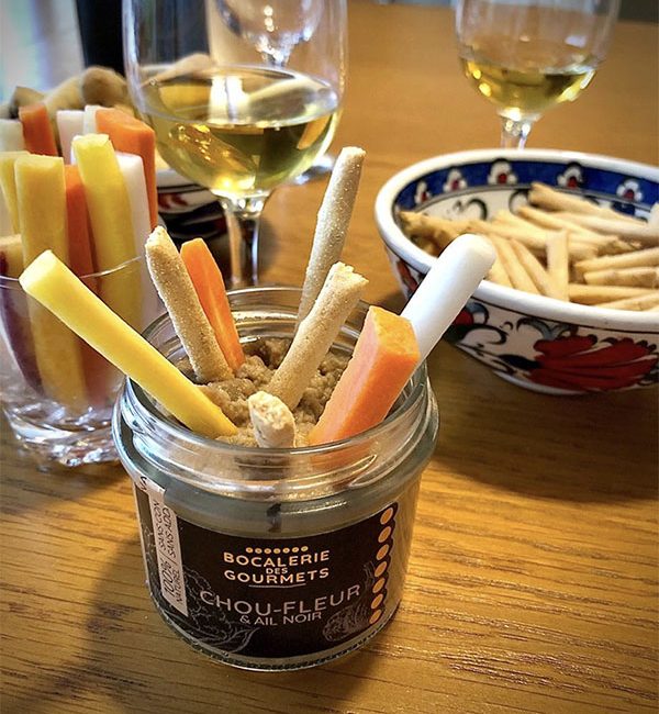 Des bâtonnets de légumes de saison (ici radis noir et carottes de couleur) et des gressins à tremper généreusement dans un tartinable Chou-fleur & ail noir !