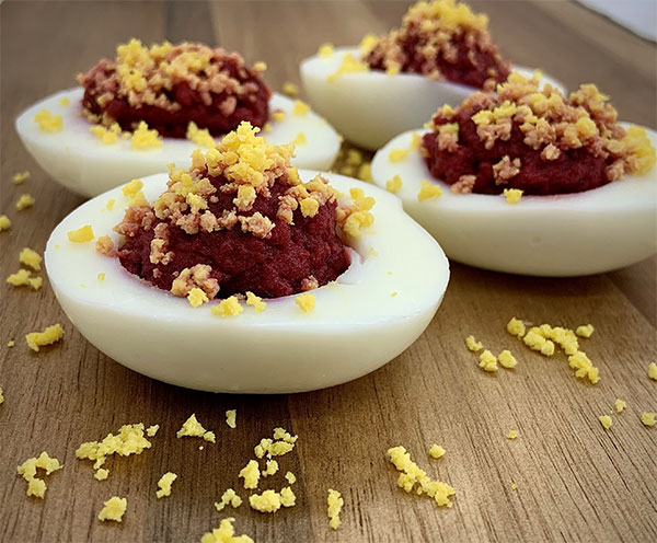 Sur la base d’une recette classique d’oeufs mimiso, remplacez la mayonnaise par le tartinable Betterave & grains de moutarde et le tour est joué !