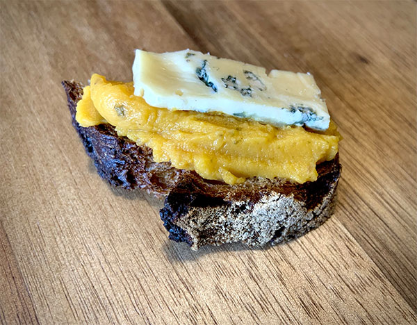 Sur une tranche de pain, déposez une cuillère de tartinable Butternut & verveine citron et ajoutez un morceau de fromage de type bleu (ici bleu du Vercors mais fourme de Montbrison ou bleu de Gex peuvent parfaitement fonctionner) !
